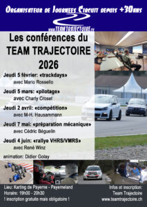 Payerne - back on track ! TeamTrajectoire.ch te donne rendez-vous le jeudi5 févrirer 2026 pour la première d'une série de 6 conférences initiatiques sur le sport automobile au Karting de Payerne - Payerneland (trackdays, pilotage, la compétition, préparation mécanique, rallye VHRS-VMRS)