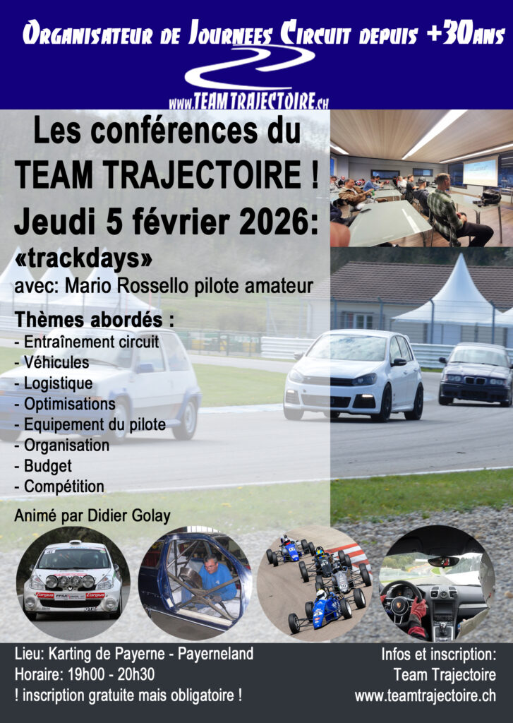 TeamTrajectoire.ch te donne rendez-vous le jeudi5 févrirer 2026 pour la première d'une série de 6 conférences initiatiques sur le sport automobile au Karting de Payerne - Payerneland