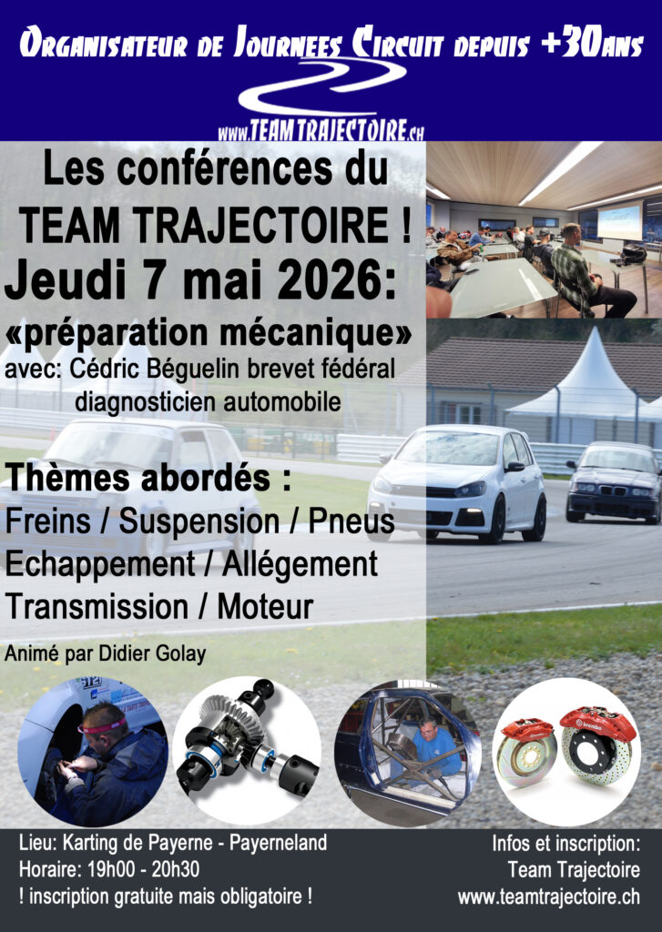 Nous nous retrouverons au Karting de Payerne pour des sessions karting, suivies par la conférence “initiatique” qui traitera de la préparation mécanique et se terminera par un souper selon proposition du jour, au restaurant du Karting ! Nous aurons l’occasion de partager nos expériences et projets.